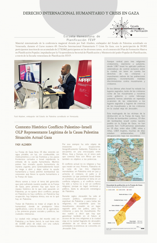 Material sistematizado de la conferencia magistral dictada por Fadi Alzaben, embajador del Estado de Palestina acreditado en Venezuela, durante el Curso numero 65: Derecho Internacional Humanitario Y Crisis En Gaza, con la participación de 39.392 participantes inscritos de un acumulado de 2.732.862 participantes en los diversos cursos, en el contexto del Plan de Formación Masiva en Planificación Popular, impulsados por la Vicepresidencia Sectorial de Planificación y Ministerio del poder Popular de Planificación, a través de la Escuela venezolana de Planificación FEVP.